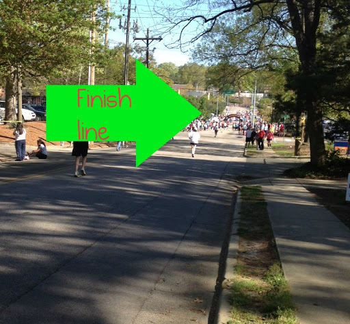 I knew I was close to the finish line when I passed my hotel which was about 4 blocks away. Then it was mostly going up and down various times. Towards the end it was a long stretch slightly downhill. Loved it! I felt like I was flying!!