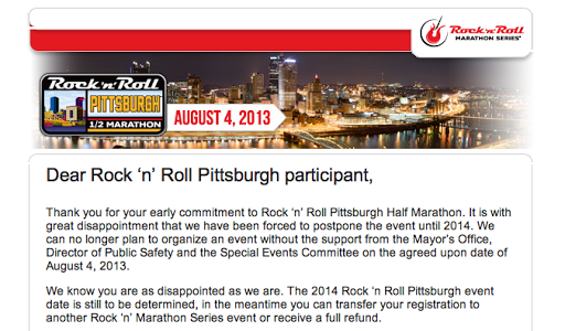 1. I received the email below. The half marathon in Pittsburg was cancelled. Dang, that would have been my race in PA. Luckily, there is another race in Philadelphia in September so I registered for that race.