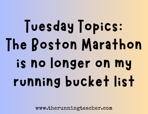 So, the Boston Marathon is no longer on my running bucket list. Heck, running a marathon is no longer on my list either. 🙂 I am OK with that decision. I want to focus on smaller races. I was going to say to also get a PR, but I don’t want to pressure myself. I want to enjoy my runs and my races. I still have a few more states to run in to finish my quest of running a half marathon in every state.